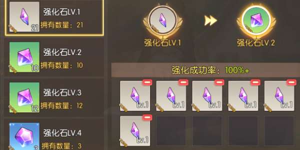 使用6个一级强化石加上一个本体强化石,可以直接跳过中间等级,直接合成高级强化石。例如,1级石头+6个1级石头直接合成3级石头。