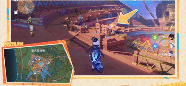 4、在【圣火竞技场】上层的看台的桌子上发现玉帛,位置如下图所示。