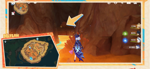 9、来到【溶水域】的地下洞窟,在岩浆湖的边缘一个柱子的后面发现一块玉帛,位置如下图所示。