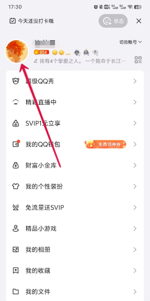 1、打开QQ后,左滑进入个人信息界面,然后点击左上角的QQ头像。