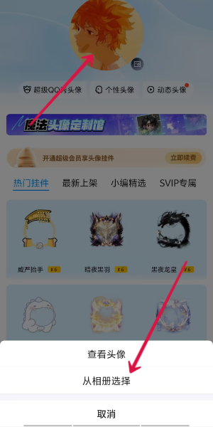3、在头像编辑界面我们再次点击自己的QQ头像下方就会出现弹窗,我们点击弹窗中的【从相册选择】,然后在相册中选择一个头像进行更换即可。