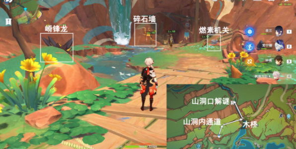 1、传送溶水域西北方向锚点,往地图的东北方向山洞内通道走,按照下图指引来到山洞口解谜。