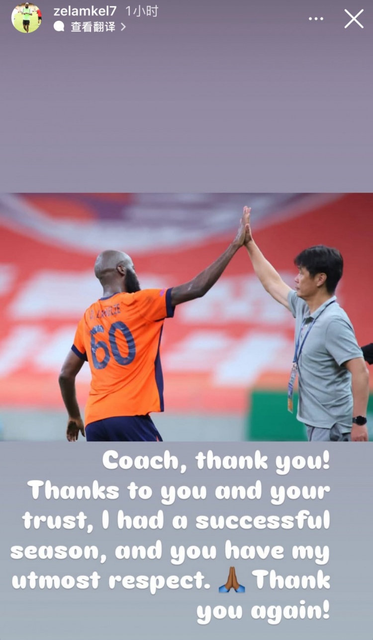 直播吧11月24日讯 因声称欠薪而提前离队的海牛外援兰克尔-泽,刚刚更新社媒动态,单独感谢了海牛主帅李霄鹏。