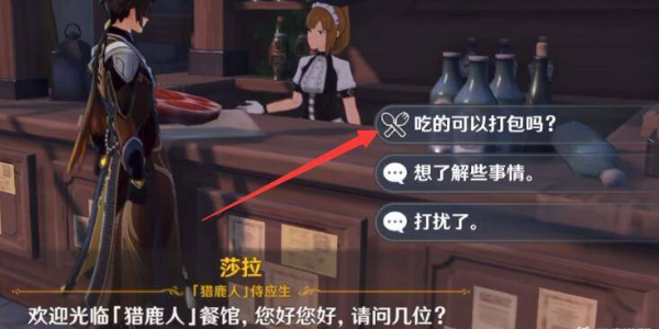 和猎鹿人餐馆的npc”莎拉“对话,选择“吃的可以打包吗?”。