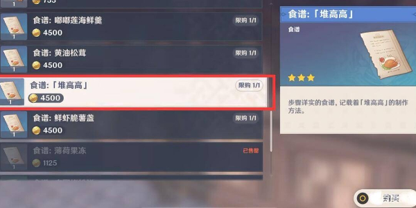 最后在商品列表中点击选择食谱“堆高高”,点击右下角“购买”按钮即可。