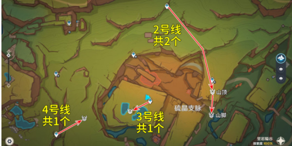 2、硫晶支脉,在硫晶支脉共分布4个大灵显化身,按照下图路线进行讨伐即可。