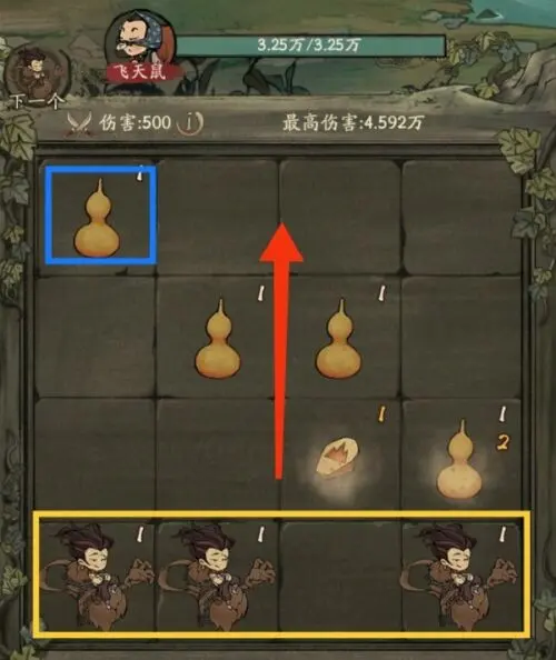 第二步:如下图,葫芦果然出现在上图的黄框范围,由于石头不会和葫芦合成,可继续向下。