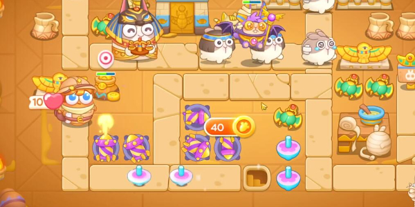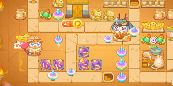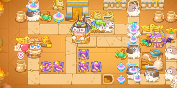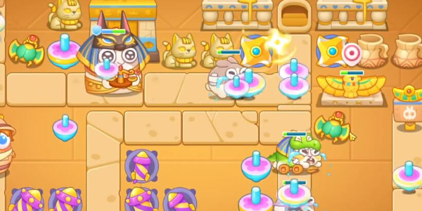 5.将上方的陀螺进行升级,随后在下方障碍物被清理完成之后放置两个火箭炮,再标记上方的钱袋清理,再将周围的障碍物清理,怪物来临优先清理怪物。