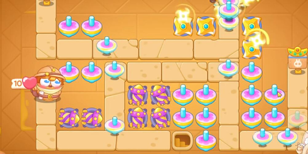 8.在右侧陀螺的上方放置第四个陀螺并进行升级,再在左侧放置第五个陀螺,标记最右侧的障碍物进行清理。