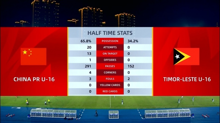 直播吧11月24日讯 U17亚洲杯预选赛A组第二轮,中国队半场6-0领先东帝汶。数据统计显示,上半场形势完全一边倒。