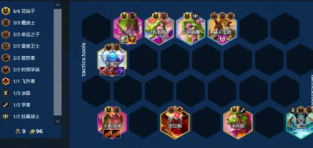 该阵容十分强势,6花仙子现在本来就强,有花仙子转可以下掉一个小炮挂件,9级可以开2命运,上限更高。