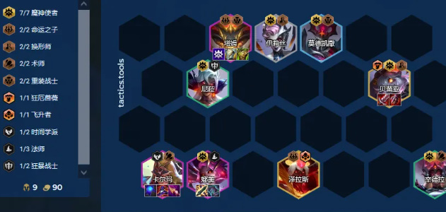 推荐法师装备连胜时考虑这套,没转职的话,不推荐硬玩。8级可以用卡尔玛,娜美双C,然后上9找二星贝蕾亚,前排带塔姆。连败需要以3星辛德拉/尼菈作上九的基石,或者有魔神专属海克斯(校园吉祥物)时玩。