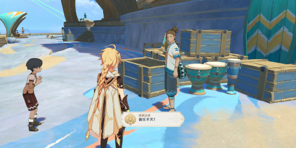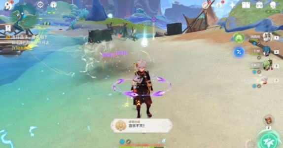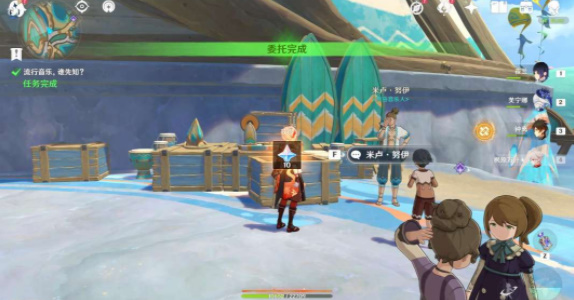 9、传送流泉之众东南方向锚点,往地图的东方向走,前往海滩边,与米卢·努伊对话,对话结束,完成任务「流行音乐,谁先知?」。