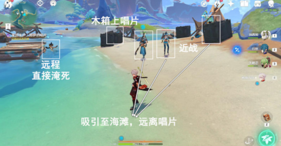 8、小编不建议使用在战斗中大范围伤害技能,容易破坏木箱上的唱片, 优先海上木筏1个远程龙形武士,可以直接淹死,海滩上3个近战龙形武士可以通过仇恨吸引,使其远离木箱上的唱片。