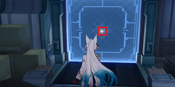 3、从台阶右转,我们来到下图所示的一堆纸箱旁,然后和旁边传送带上的闪光点交互。