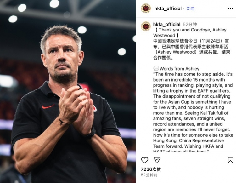 在本月进行的亚洲杯预选赛第三阶段第5轮比赛中,中国香港主场1-2不敌新加坡队,提前一轮无缘亚洲杯正赛,最终这也导致韦斯特伍德下课。