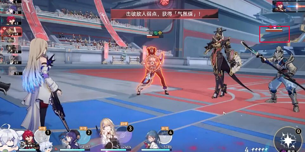 4、进入战斗我们优先使用对应的弱点角色击破旁边小怪的盾,只要击破小怪的盾就可以获得气氛值从而将其消灭,并且使中间的精英怪的弱点显现。