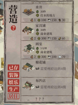 4、建造居住类别内的建筑(如水井、家具铺)并进行生产。