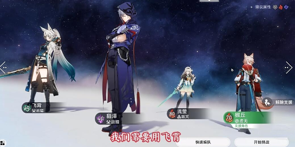 2、我们随便进入一处挑战,使用飞霄、椒丘、貊泽组队,如果缺少一个角色,可以通过支援列表中借用。