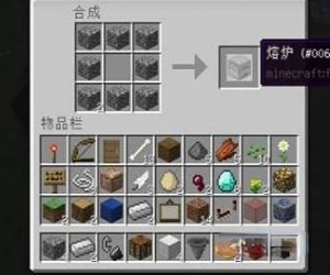 3、使用石镐挖取大量铁矿石,铁矿石不直接合成铁砧,需要先进行熔炼,熔炼需要使用熔炉,熔炉可以用圆石合成。