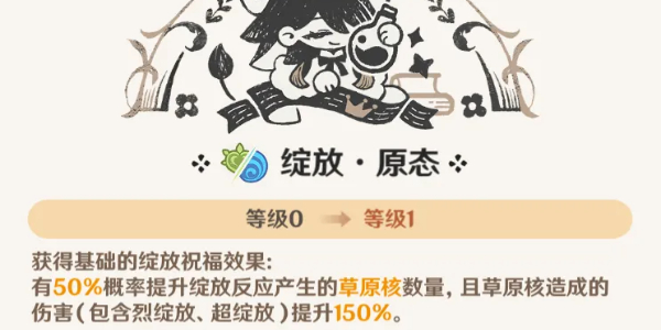 1、获得基础的绽放祝福效果:有50%概率提升绽放反应产生的草原核数量,且草原核造成的伤害(包含烈绽放、超绽放)提升150%。