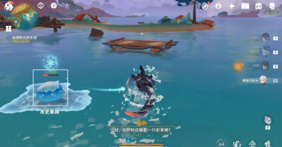 2、靠近泳圈交互“清除”,使用鳍游龙战技攻击木箱,会出现冰史莱姆,然后将其击败。