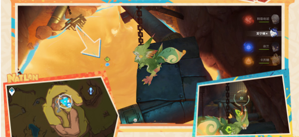 2、附身匿草龙,顺着管道前进,来到下图这个位置(触发剧情),吸取岩浆里的球,发射到铁门前的底座上,就可以开启铁门。