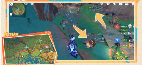 1、来到【悬木人】西侧的山脚,位置如下图所示,先附身峭锋龙,再普攻岩壁旁的机关,注入燃素;