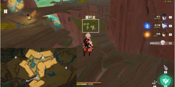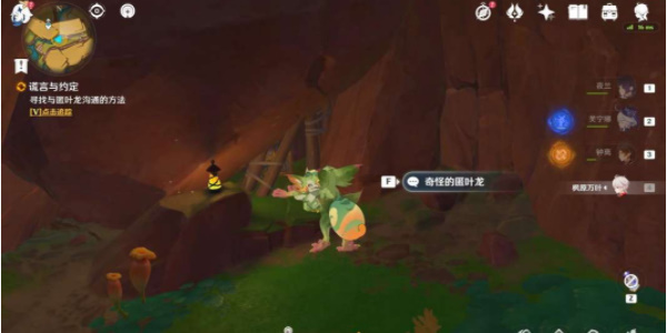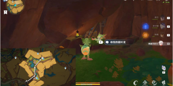 我们先传送彩石顶西南方向山洞内锚点,往地图的西南方向走,附身匿叶龙的龙魂,然后按照按图中指引路线走,来到山洞深处,交互“奇怪的匿叶龙”接取任务。