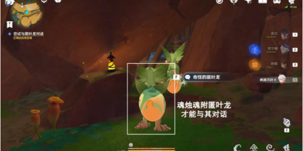 1、接取任务后,玩家需要寻找和奇怪的匿叶龙沟通的方法。我们第2次交互“奇怪的匿叶龙”,魂附效果被解除,留下魂烛。