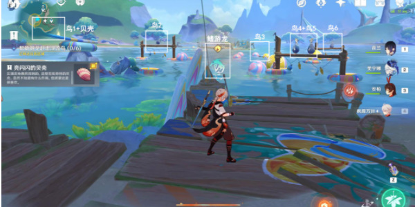 1、接取任务后,附神鳍游龙,按图中指引位置击落6只浮流鸟将其赶走;调查贝壳位置,获得亮闪闪的贝壳①。
