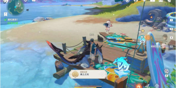 5、接着我们返回一开始的码头,与朗戈对话,选择“恩,开始吧。”,开启限时挑战;挑战任务是需要玩家收集「游光球」并抵达终点;最后完成挑战,和朗戈对话结束,就可以完成任务「踏虹破浪!」,并获得成就「湖上之光」,以及一个珍贵的宝箱和一个普通的宝箱。