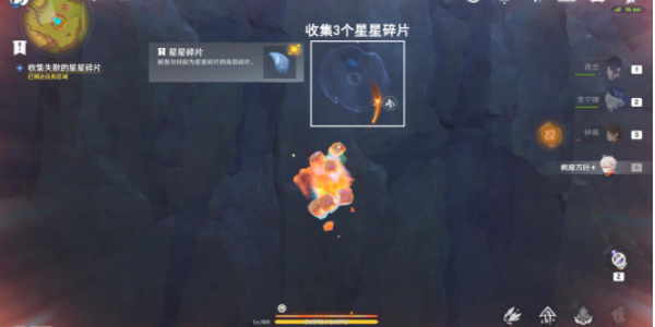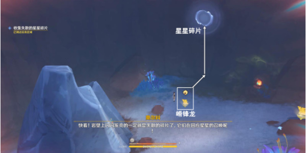 3、接着我们在岩壁周围,收集3个星星碎片;碎片收集完成后返回星星坑底,与奥尔科对话。