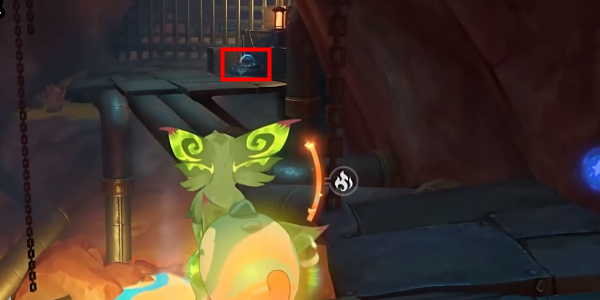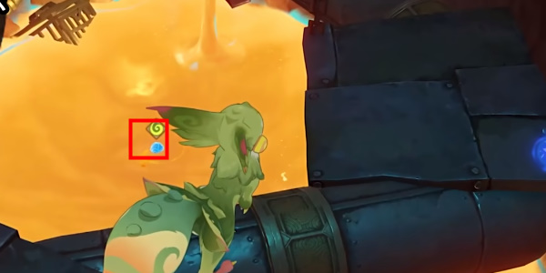 4、来到岩浆池边,使用匿叶龙吸取岩浆中的水球,然后将水球射到铁门旁的机关上就可以打开铁门。