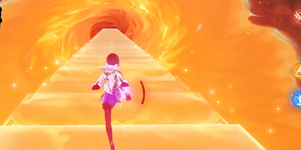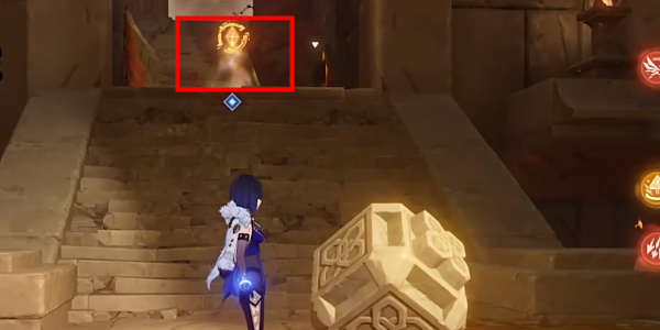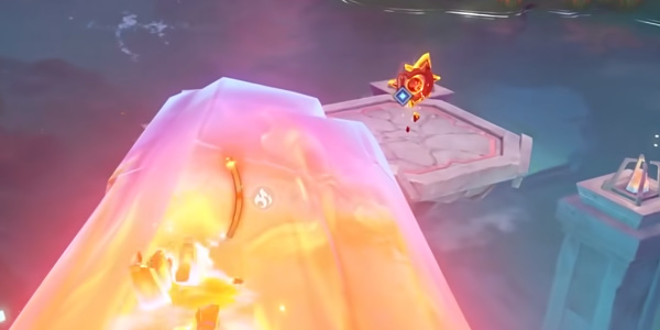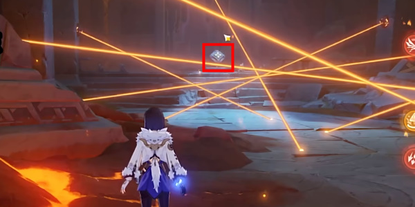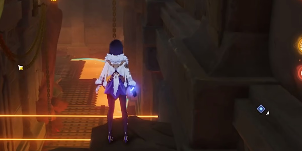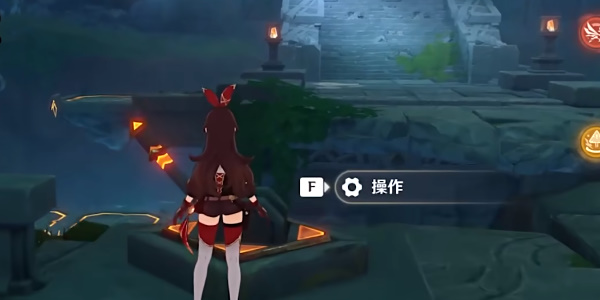 6、视角切换回角色视角,然后打开风之翼来到机关操作按钮旁(途中不能碰到机关,一旦碰到机关岩浆就会上涨。),操作按钮关闭机关。