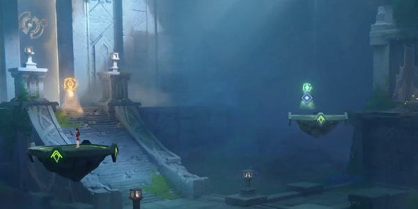 4、来到遗迹深处,让我们的角色和小龙站在不同的光圈中从而打开屏障穿过廊道。