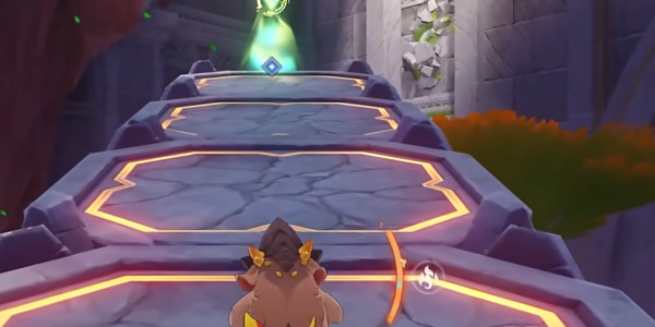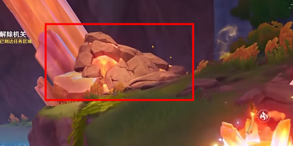 5、继续操作小龙往遗迹深处探索,来到下图所示的大石柱前,打碎石堆出现震颤晶石,然后攻击震颤晶石引发共振,然后操作小龙来到水池中的机关旁。