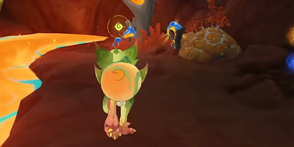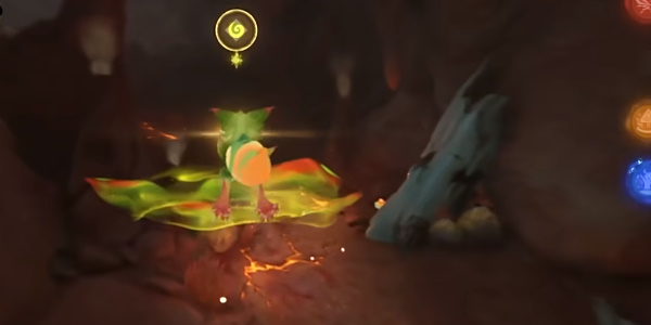 7、沿着岩浆河流前进,来到阻挡岩浆流动的石壁前,通过匿叶龙将吃下的国球吐出来击碎岩壁,使岩进入岩浆湖就可以火焰燃素就可以上涨。