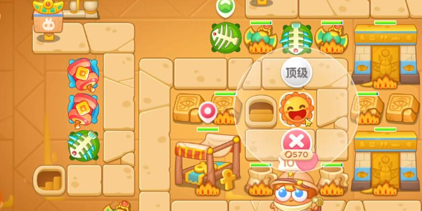 1.将左侧下方放置鱼骨升到满级,再在上方鞭炮并升级,标记左侧的障碍物进行清理。