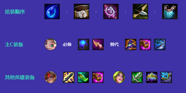 佐伊:必备装备为蓝霸符、纳什之牙,替代装备为班克斯的魔法帽、珠光护手、巨人捕手
