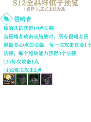你的队伍获得10点法强。当侵略者攻击或施放时,所有侵略者获得最多40点的法强;每一次攻击获得1个法强,每个施放能力获得3个法强。