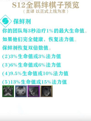 你的团队每3秒治疗1%的最大生命值。如果他们完全健康,恢复法力值。保鲜剂恢复双倍数值。