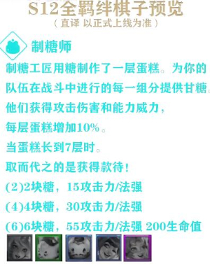 制糖工匠用糖制作了一层蛋糕。为你的队伍在战斗中进行的每一组分提供甘糖。他们获得攻击伤害和能力威力,