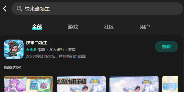 2.安装完软件以后点击进入,在上方搜索栏搜索快来当领主,点击查看进入界面。