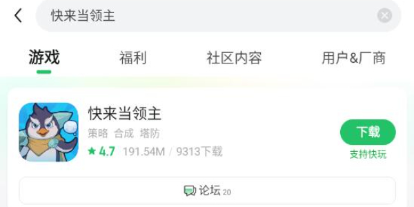 2.安装完以后点击进入软件,在搜索栏搜索快来当领主,点击下载即可。