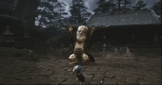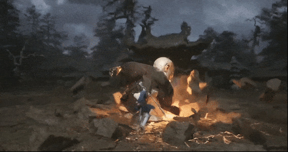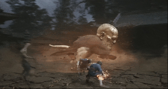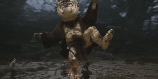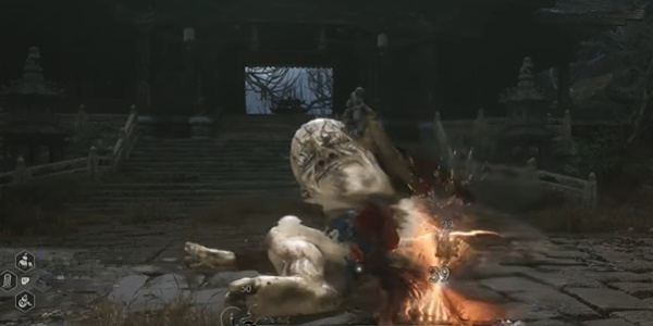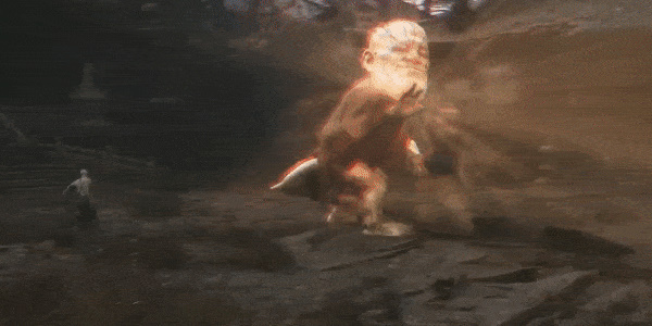 金池长老双脚踏地,形成一定范围的冲击伤害,跃起后踏地的冲击范围更广。