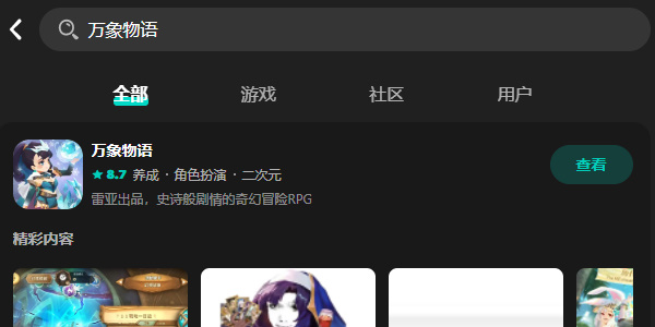 2.安装完成以后点击软件进入,在上方搜索万象物语,随后点击查看。