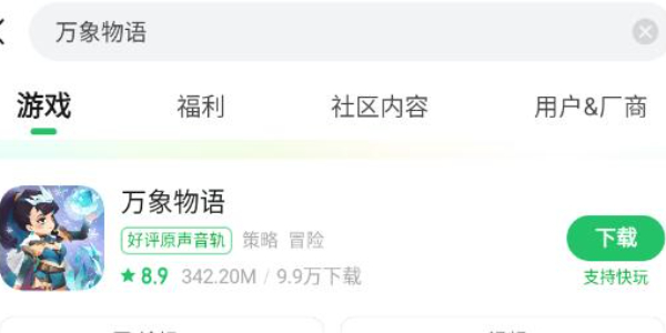 2.安装完成以后点击软件进入,在上方搜索万象物语,点击右侧的下载即可。