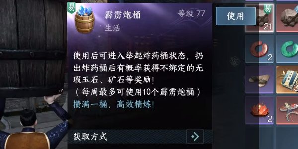 7.将趣味技能栏中的【霹雳桶】拖到技能栏中,再进行使用将桶丢出去,获取可交易矿石、矿渣等等,概率获取可交易无暇玉石。