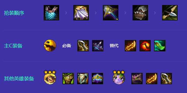优先在3-2的时候拉6级,并且让其余的棋子进行升级到2星,4-1要追努努,克格莫,崔丝塔娜的3星。9级补塔里克和戴安娜,最后堡垒凑齐4件套即可形成完整的阵容搭配。